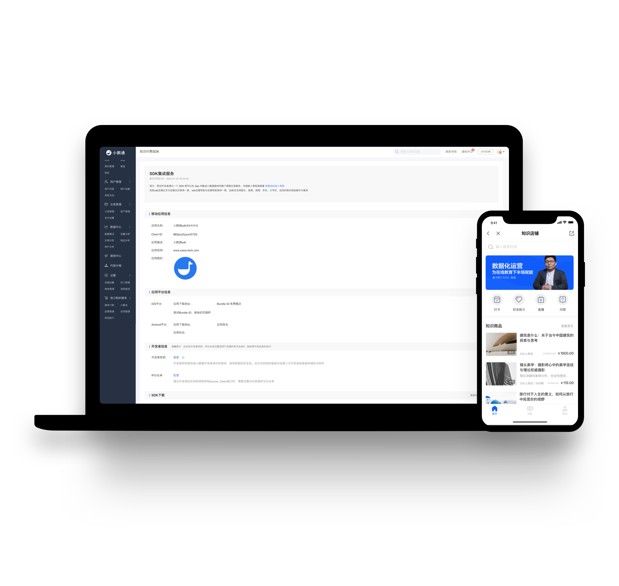 支持以内嵌SDK的形式接入商家现有的APP,打造内嵌于APP里的知识课堂,并为商家提供一站式的用户集成管理。